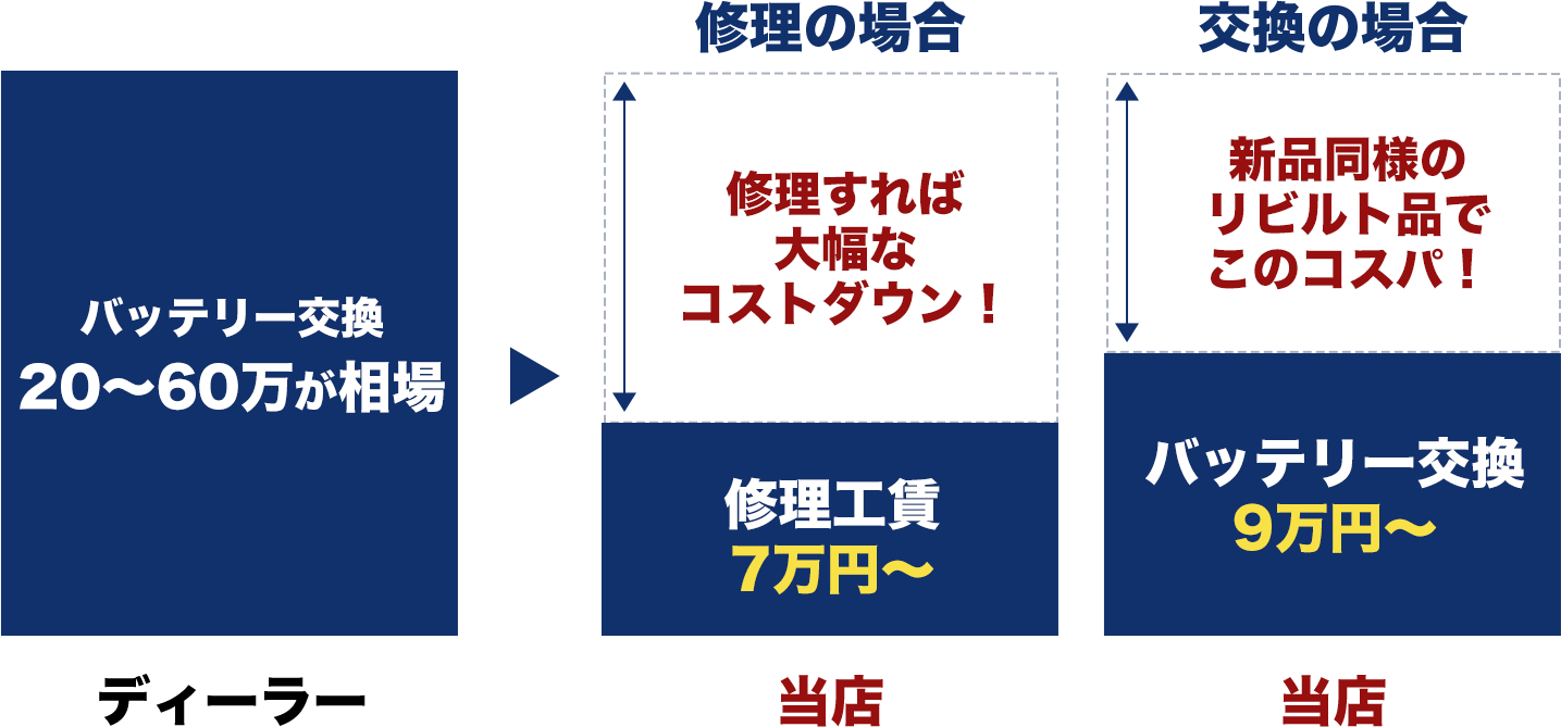 ハイブリッドバッリーの修理はディーラーでは請け負ってもらえず、必ず新品への交換となってしまいます。